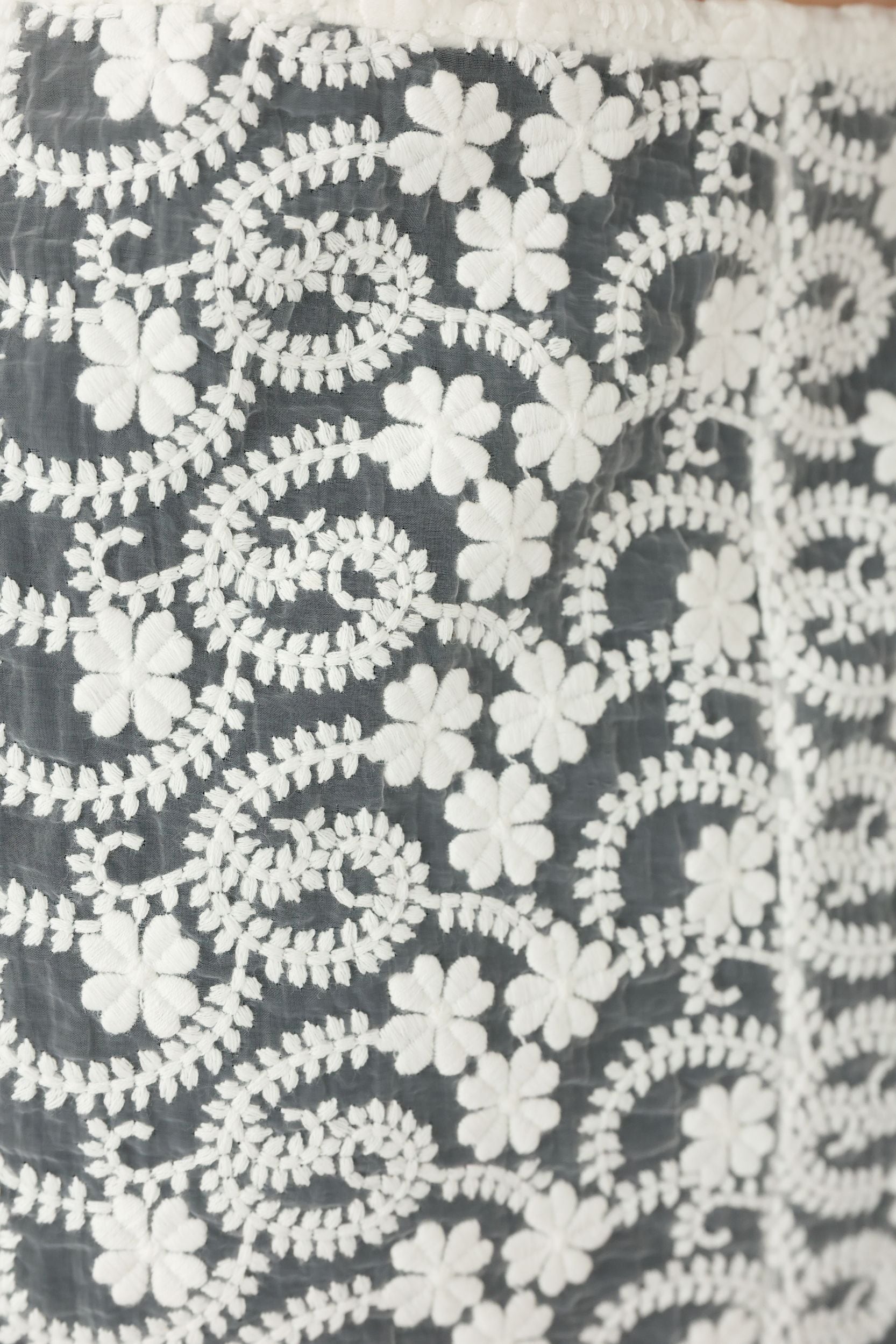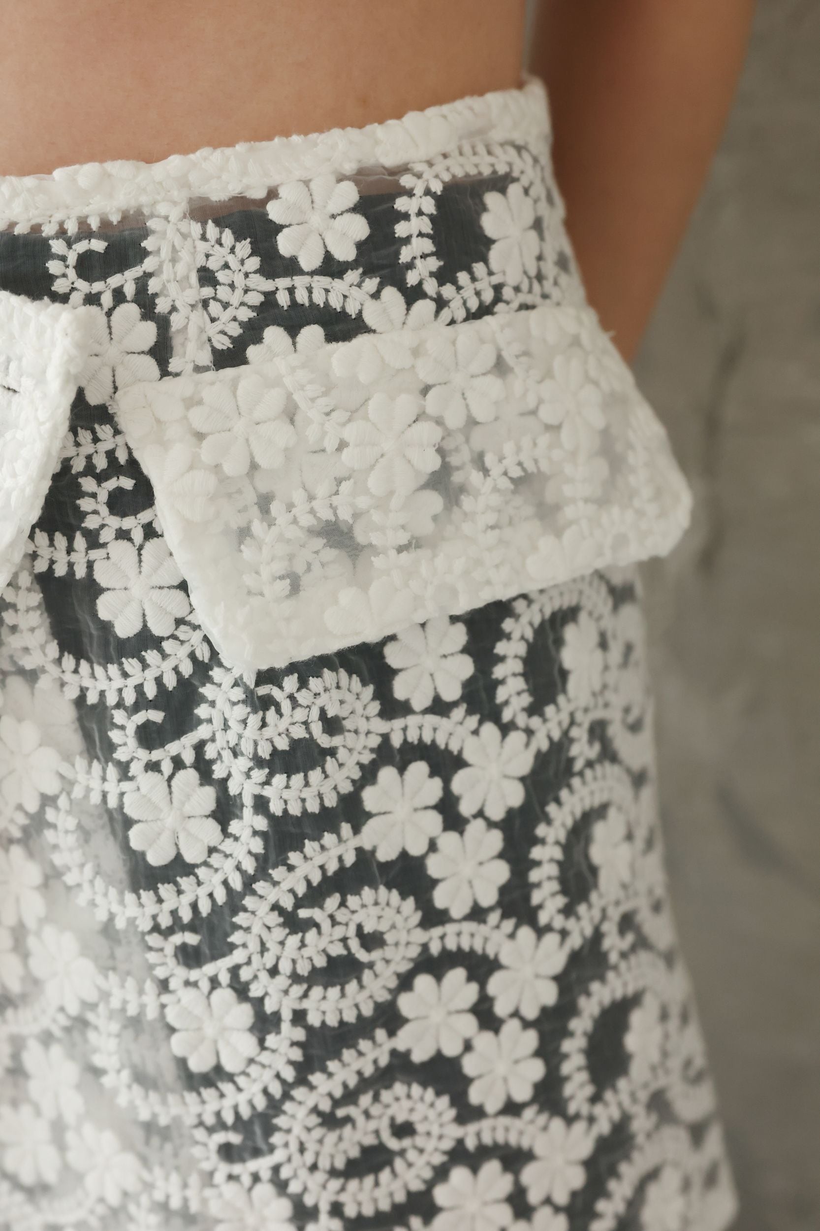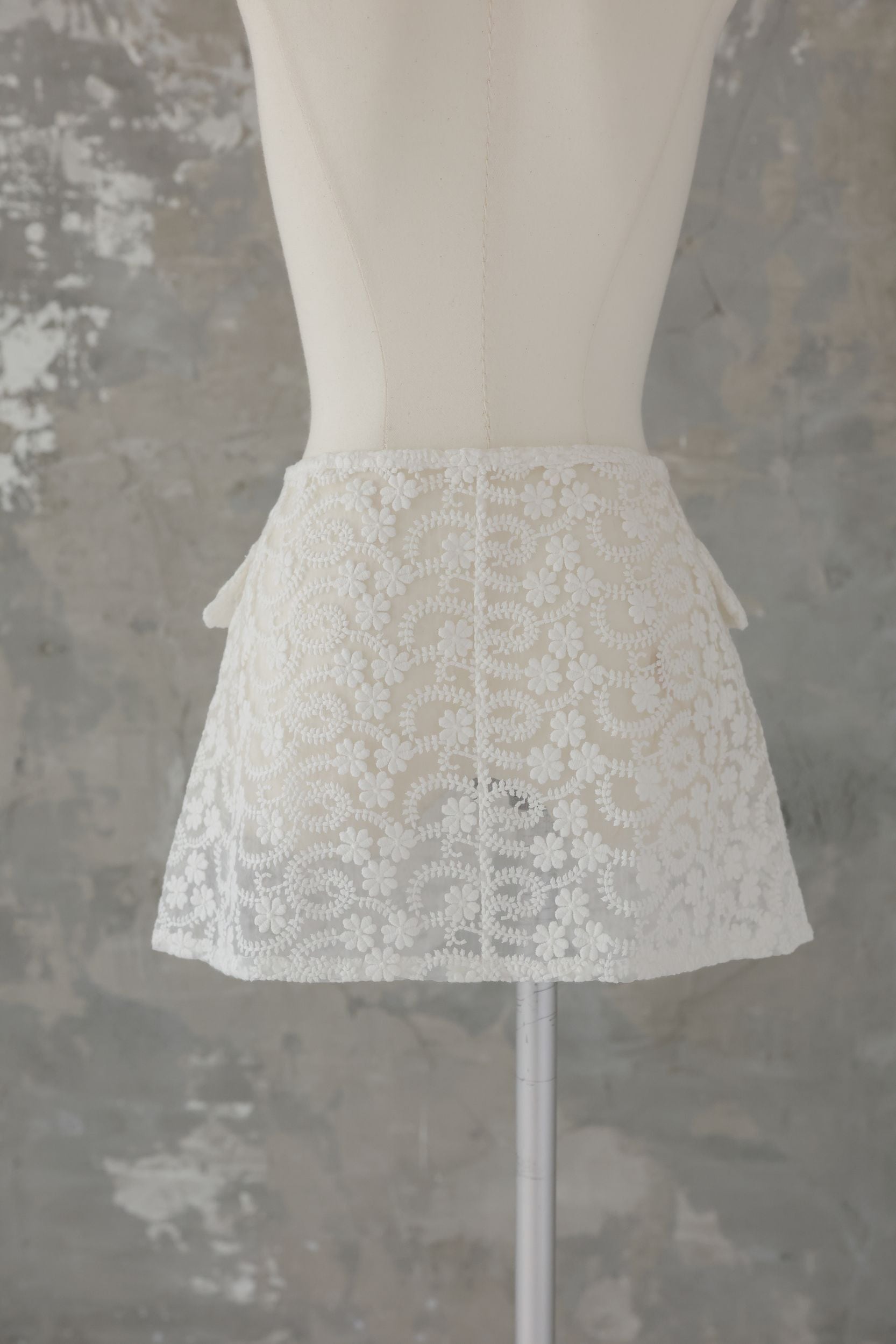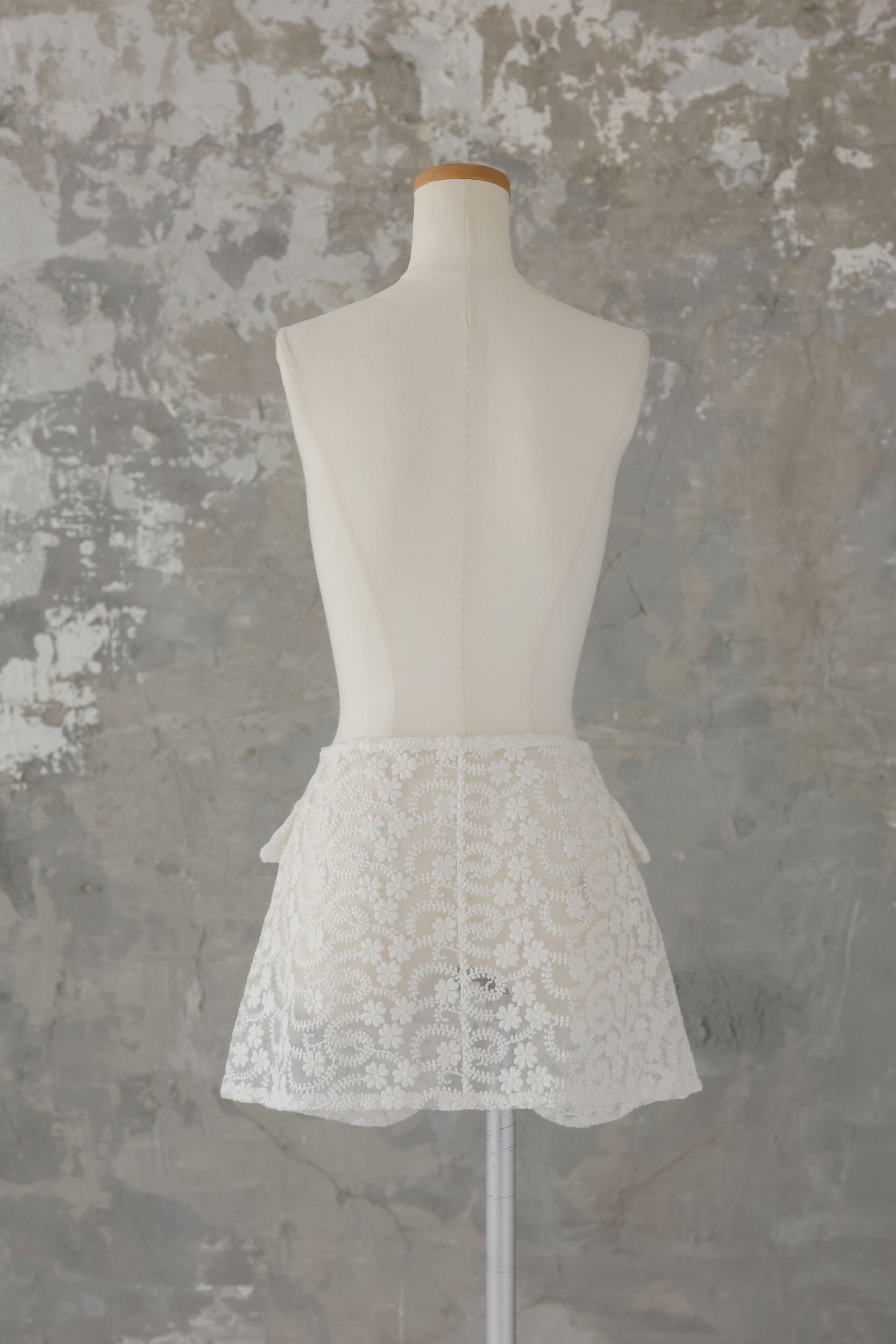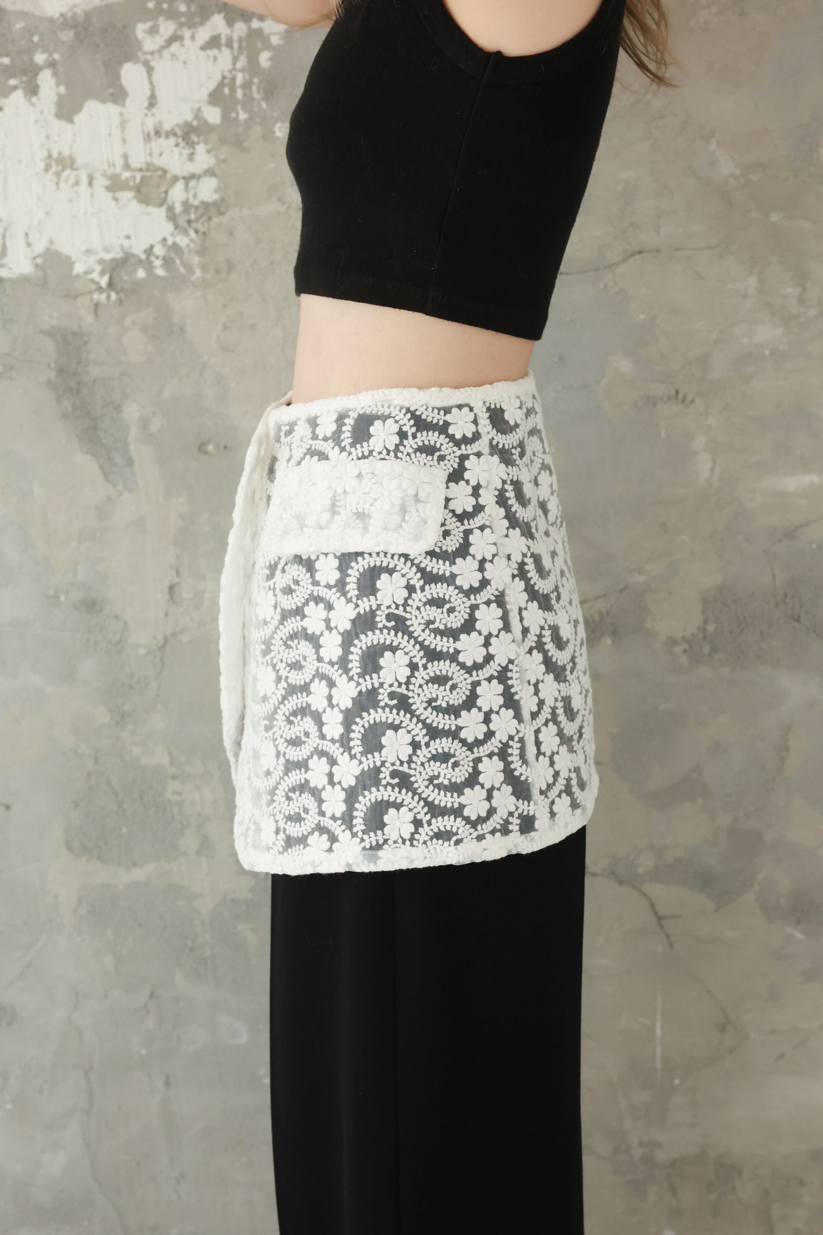 ハリのある透け感が特徴の素材の全体を覆うフラワーモチーフの刺繍がアクセントのレイヤード用のスカートです。独自のレイヤーデザインのアイテムは、日常にコーディネートに華やかさをプラスします。シンプルなトップスと組み合わせれば、カジュアルな日常使いにも、特別な場面にも対応できる万能スカートです。特に、フィット感やシルエットにこだわっており、フロントのボタンで調整が可能です。