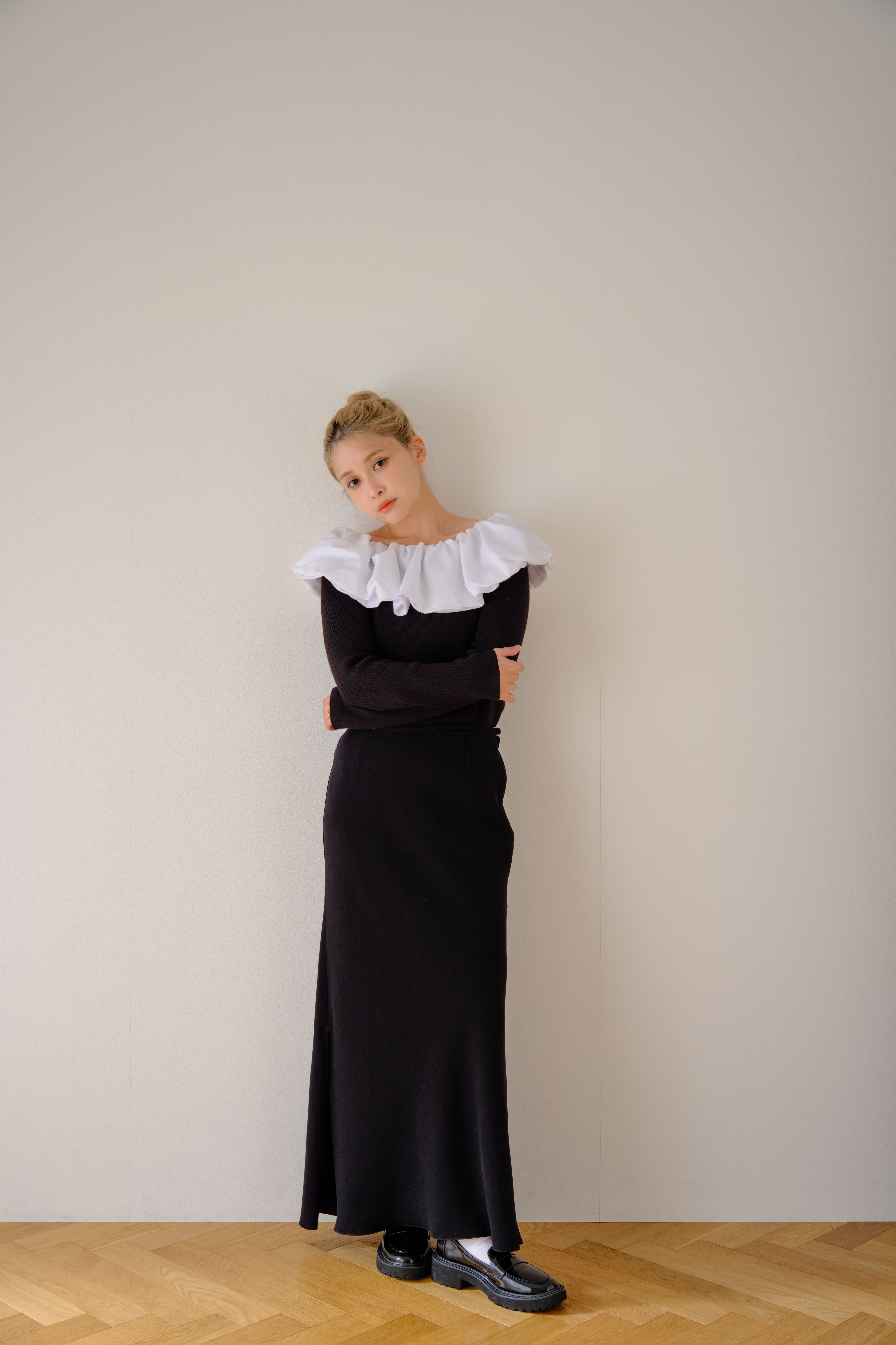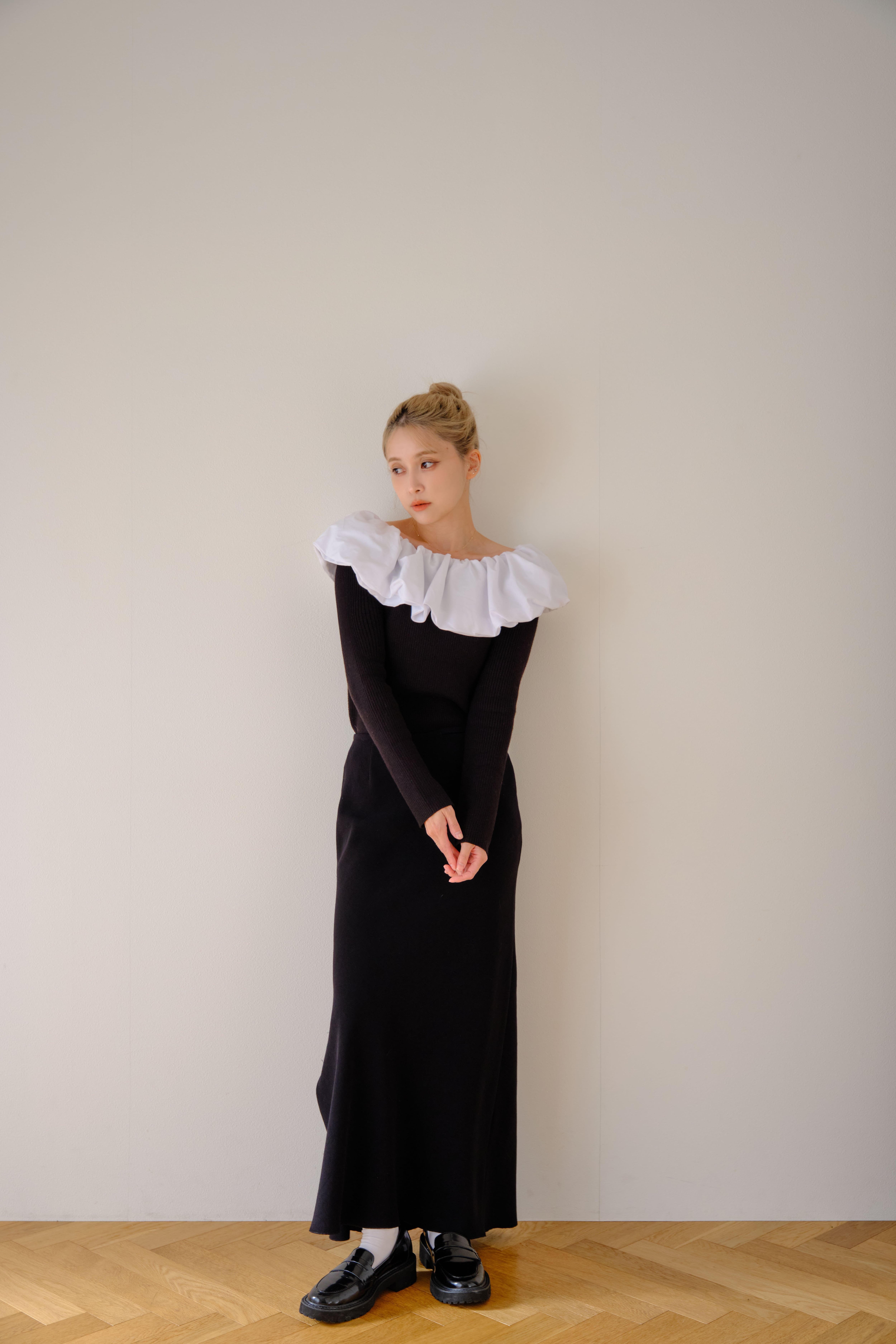 すっきりとした見頃に、別布で仕立てたボリュームのあるフリルを組み合わせ、コントラストの効いたデザインに仕上げました。