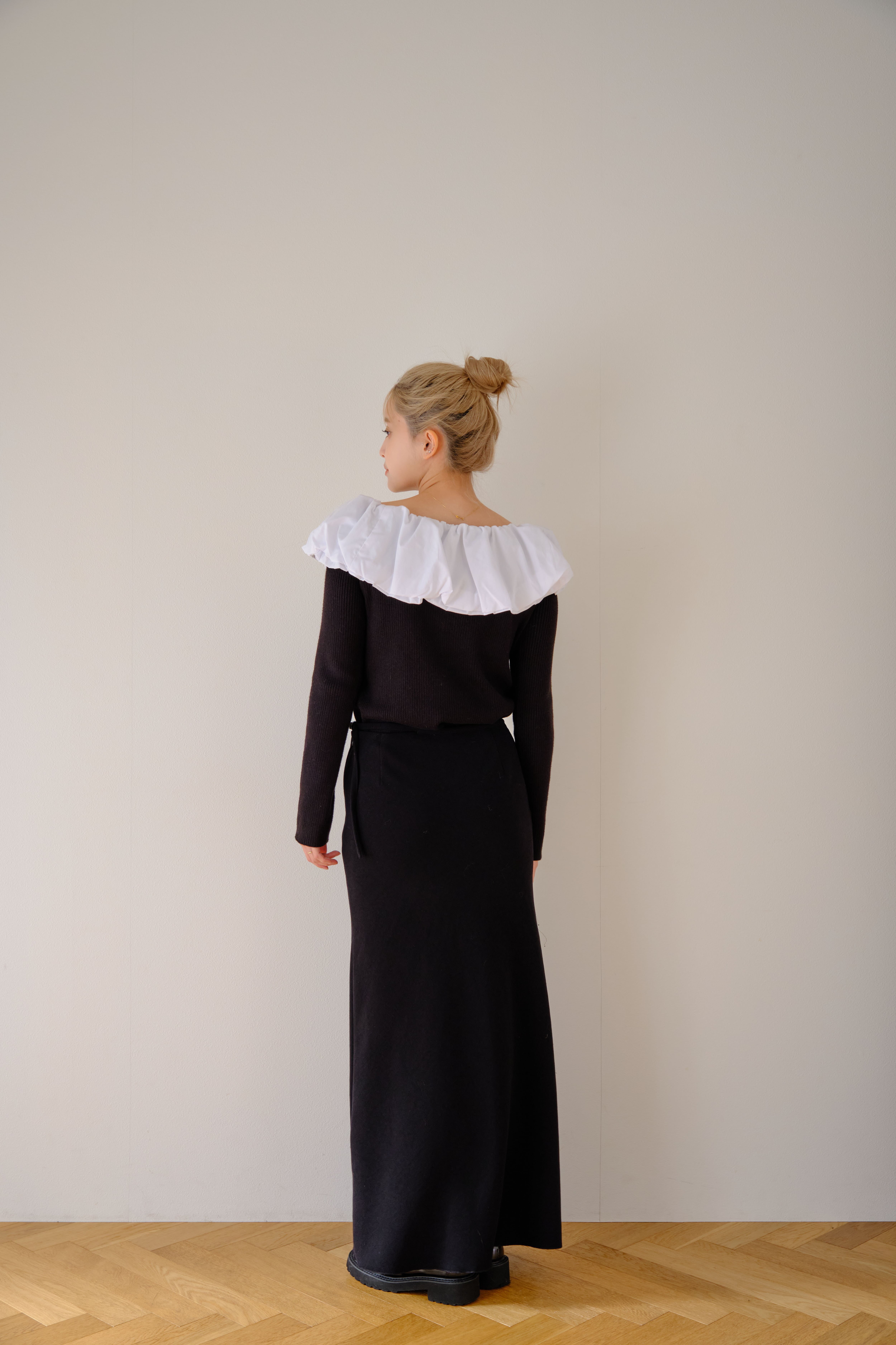 伸縮性の高いリブニットを使用したオフショルダーニット。