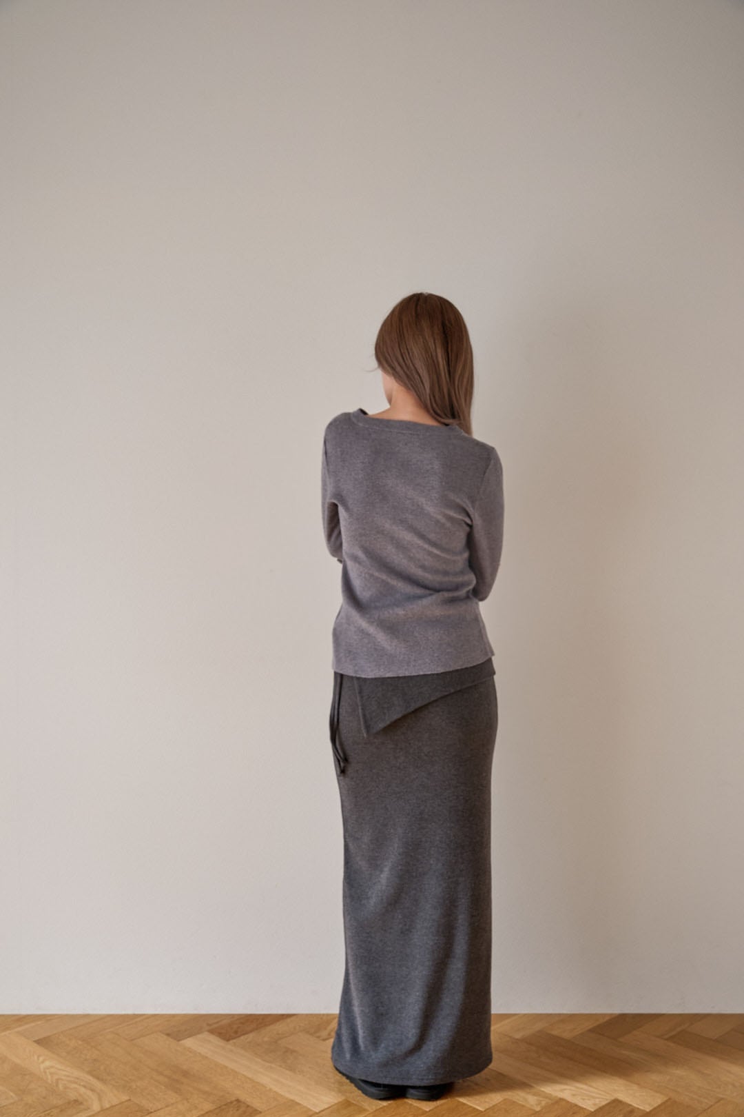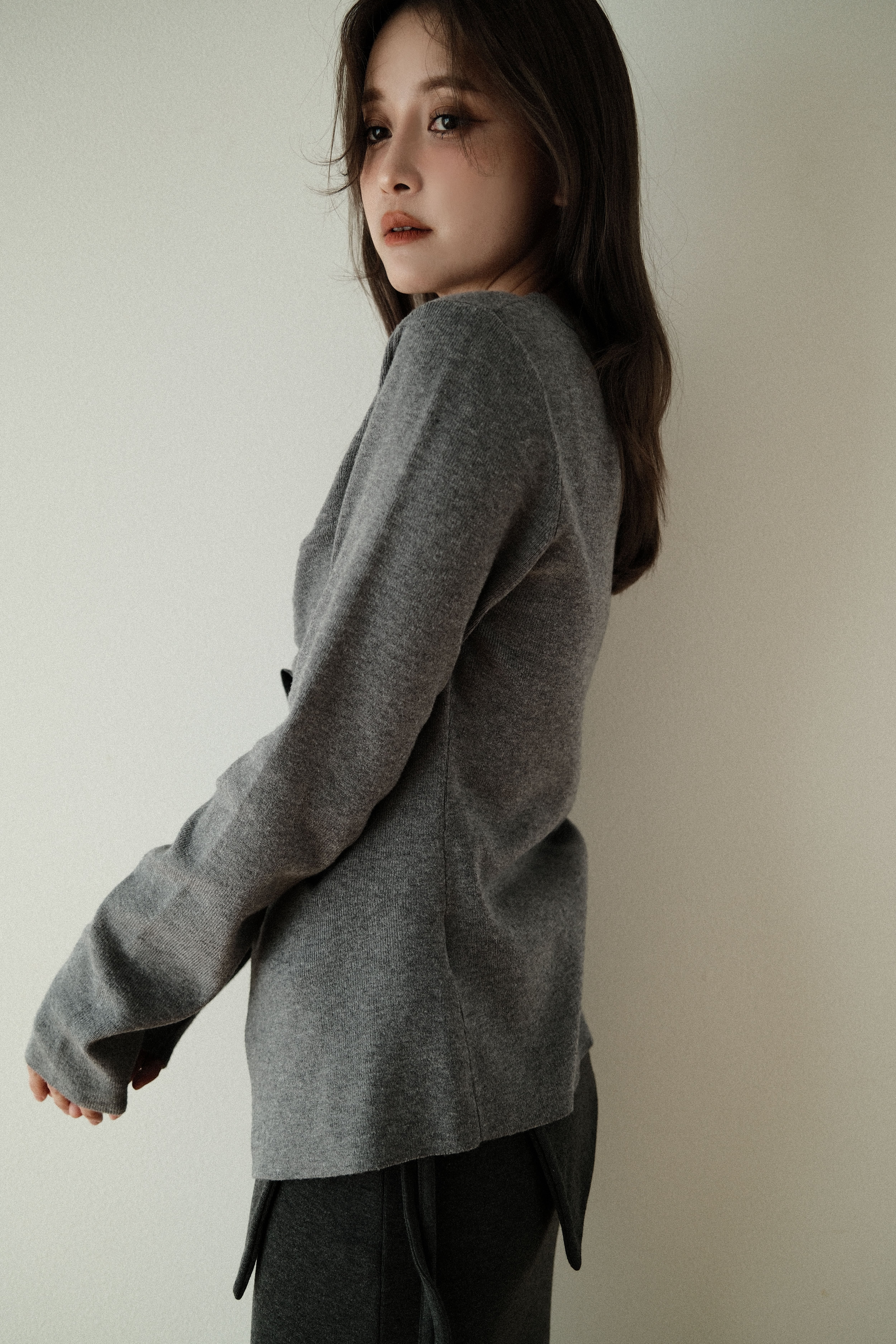 柔らかく落ち感のある素材を活かし、身体に沿うような立体的なシルエットに仕上げています。