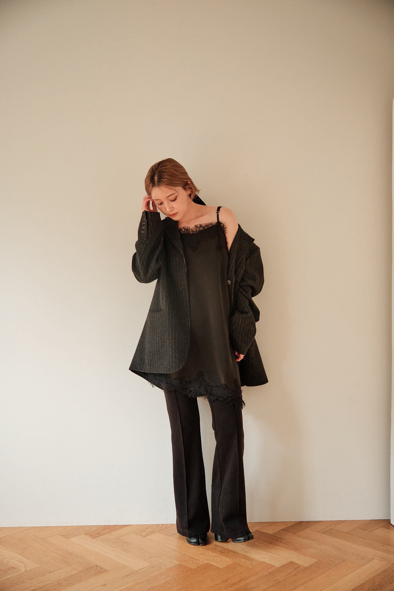 動くたびに揺れる質感が、シンプルなスタイリングに奥行きをつくります。