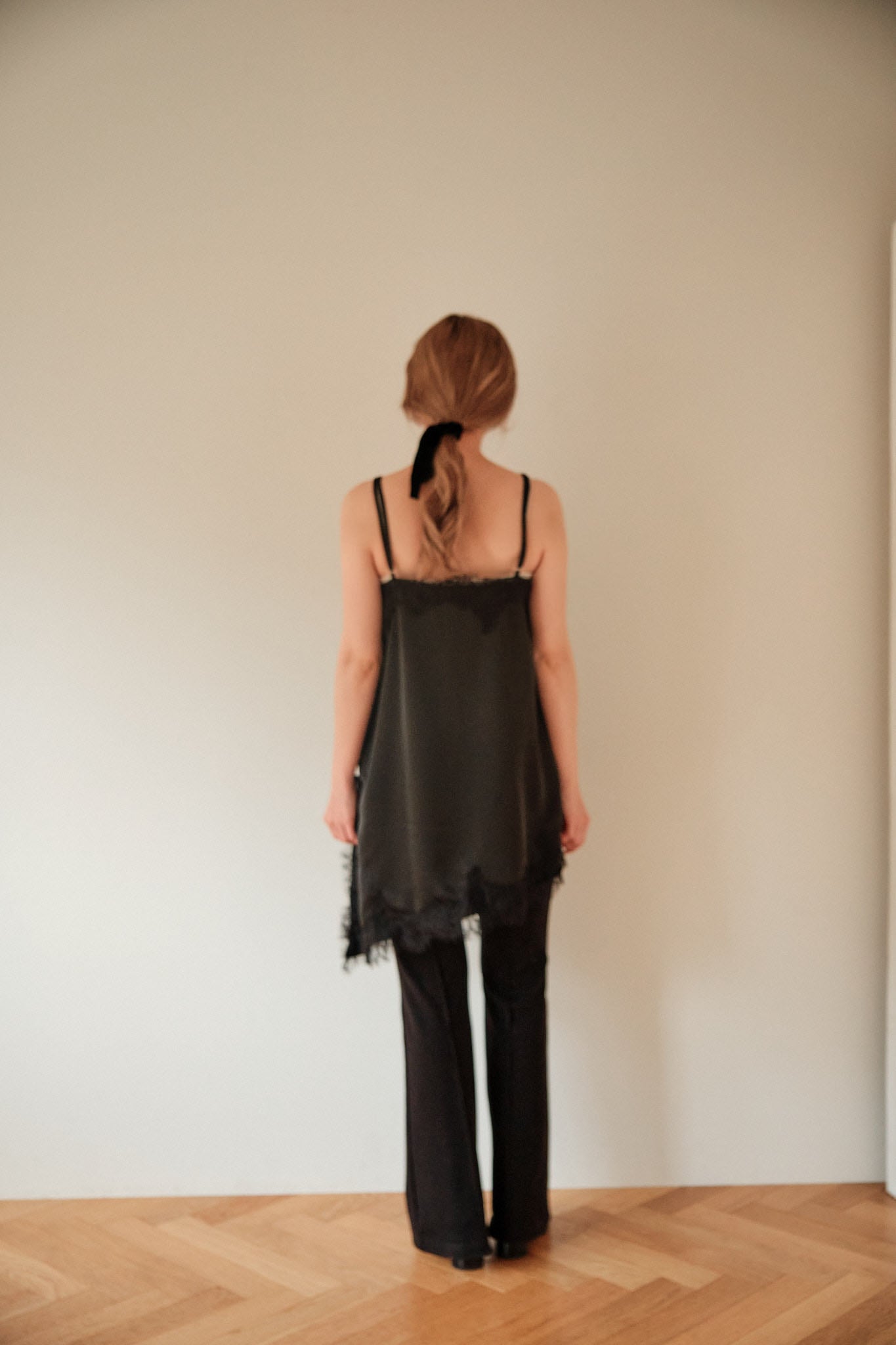 アシンメトリーなヘムラインと、繊細なレース。